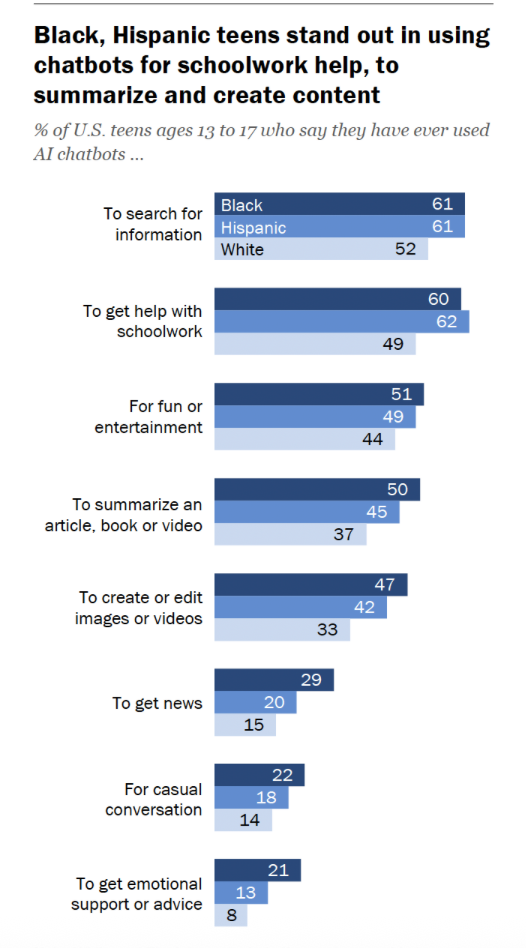 Surprisingly, both studies report that teens most commonly use AI for seeking information and brainstorming—not primarily for schoolwork. As one young person put it: